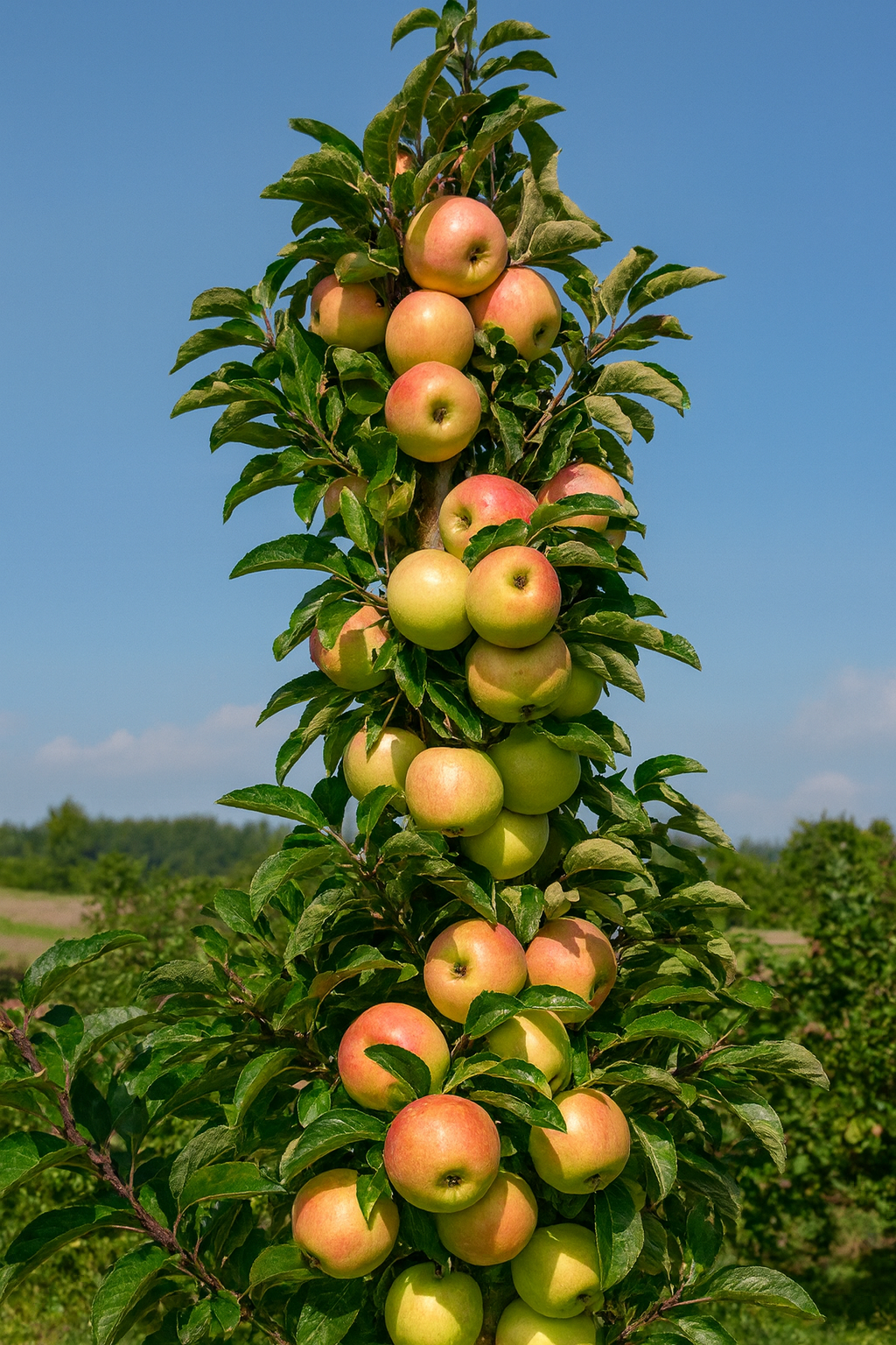 Columnar apple trees are bred for compact, upright growth, making them ideal for small spaces, urban gardens, containers, hedges, or orchards. They grow 8–10 feet tall but just 2–3 feet wide, with fruiting spurs along the trunk and upward-growing branches.