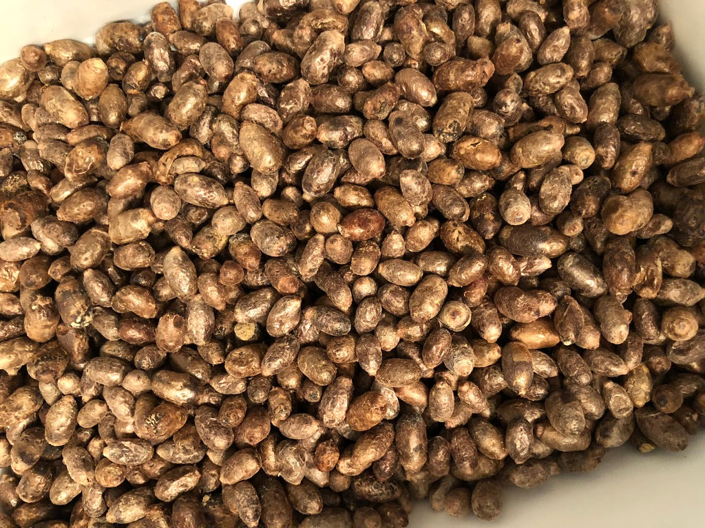 These cocoons are harvested from our mason bee houses in the winter and stored in the fridge until spring. This process allows us to clean the cocoons - washing away pollen mites - an essential step in supporting our native bees' survival. Pollen mites compete for food with young mason bees (larvae), causing them to starve.